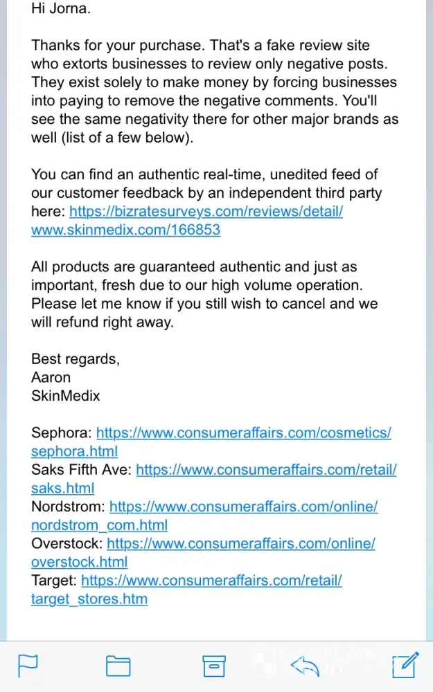 I ordered PCA pigment gel from SkinMedix I then read all the negative reviews about the company and emailed the company requesting cancellation. To my surprise I was informed the negative reviews were false in order to extort money from the business, persuading them for payment to remove false negative reviews. However, as I intended to use the product on my face I was unwilling to take the risk and requested cancellation and a refund. To my amazement I was refunded immediately without any hesitation. Contradictory to what the reviews claim.