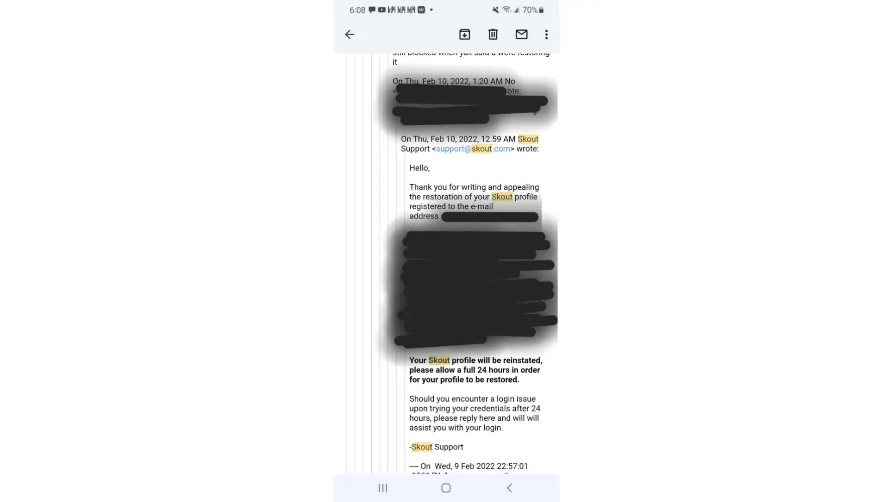I was on Skout one day watching my friend stream. We were all chatting and suddenly, I was kicked from the live. I tried to rejoin, but it showed "We're cleaning up the LIVE theatre right now" so I gave up and decided to go back later. I went back later, and my account was closed. I tried to log back in, and my account was blocked. I have messaged Skout support repeatedly and each time I ask what terms I violated they ignore me! And I know for a fact I did not violate any terms of service! I don't post anything promiscuous, and I don't show anything inappropriate when i'm on stream. I didn't say anything inappropriate to warrant a ban. I am beyond angry, because I have put money into my account, and I use it on my friends! I can't even get a refund for all the money i've put into it! 92nd