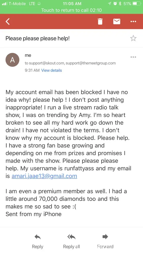 I have been a Skout member for several years.I haven't used it for awhile though.I tried to login to my account and I got a message saying login failed You have been blocked for using this service for breaking our terms of service.Appeal by emailing support@skout.com.I emailed support@skout.com.I messaged them and asked them how I violated their terms of service but they didn't reply back though