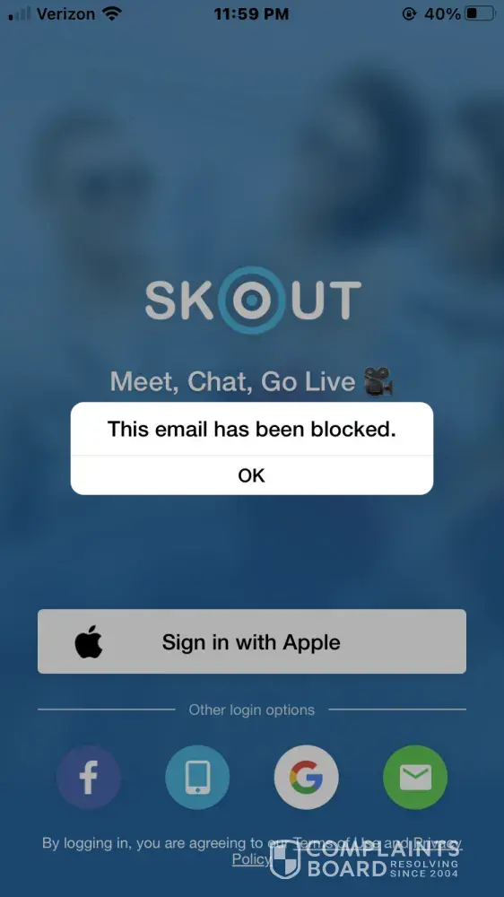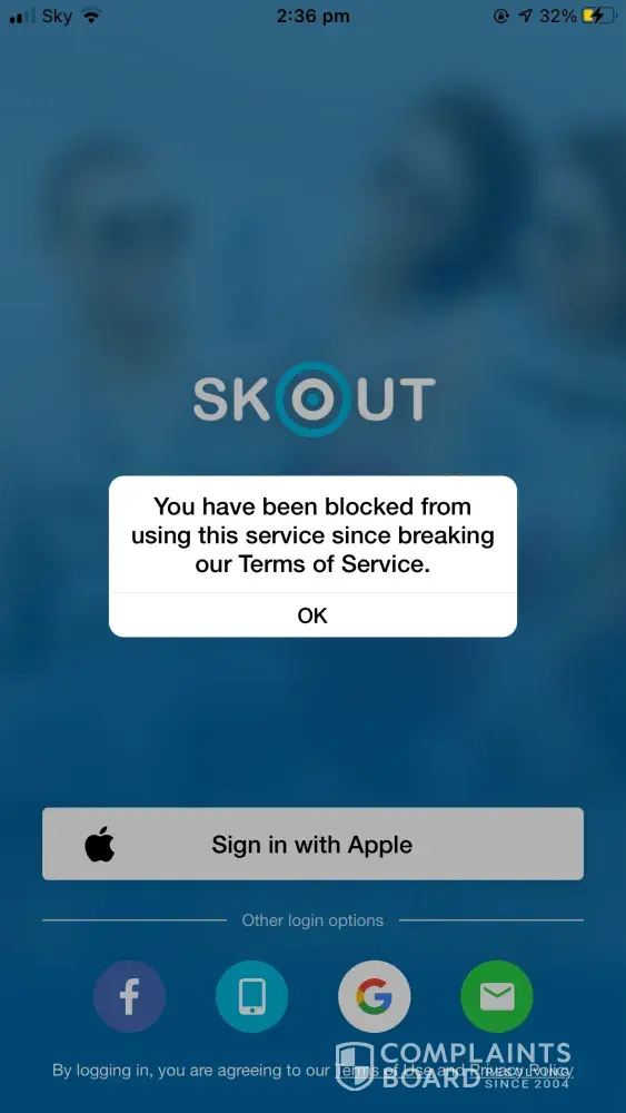 Create new account but SKOUT customer service said I am blocked from SKOUT team because of terms and conditions