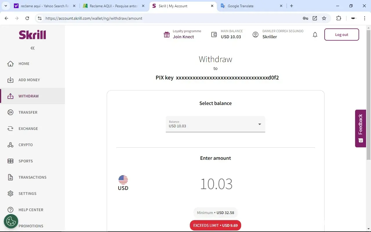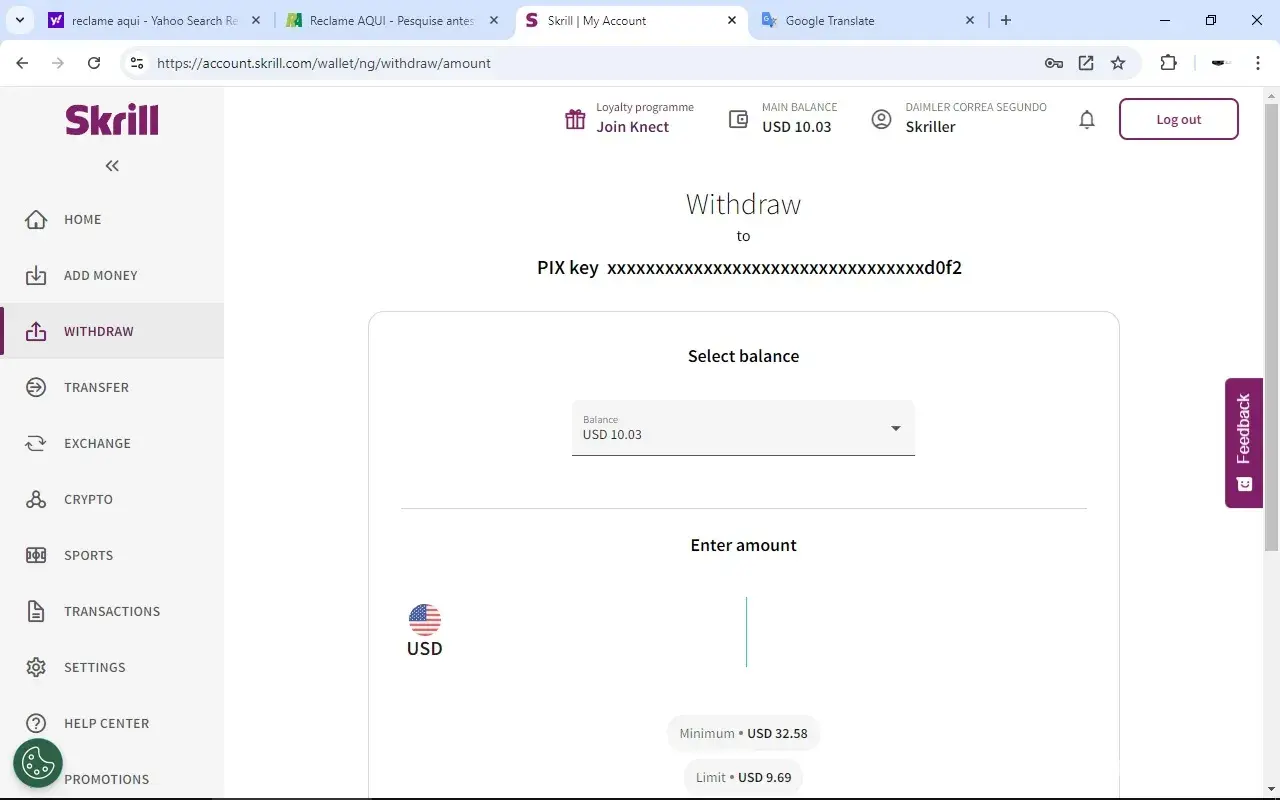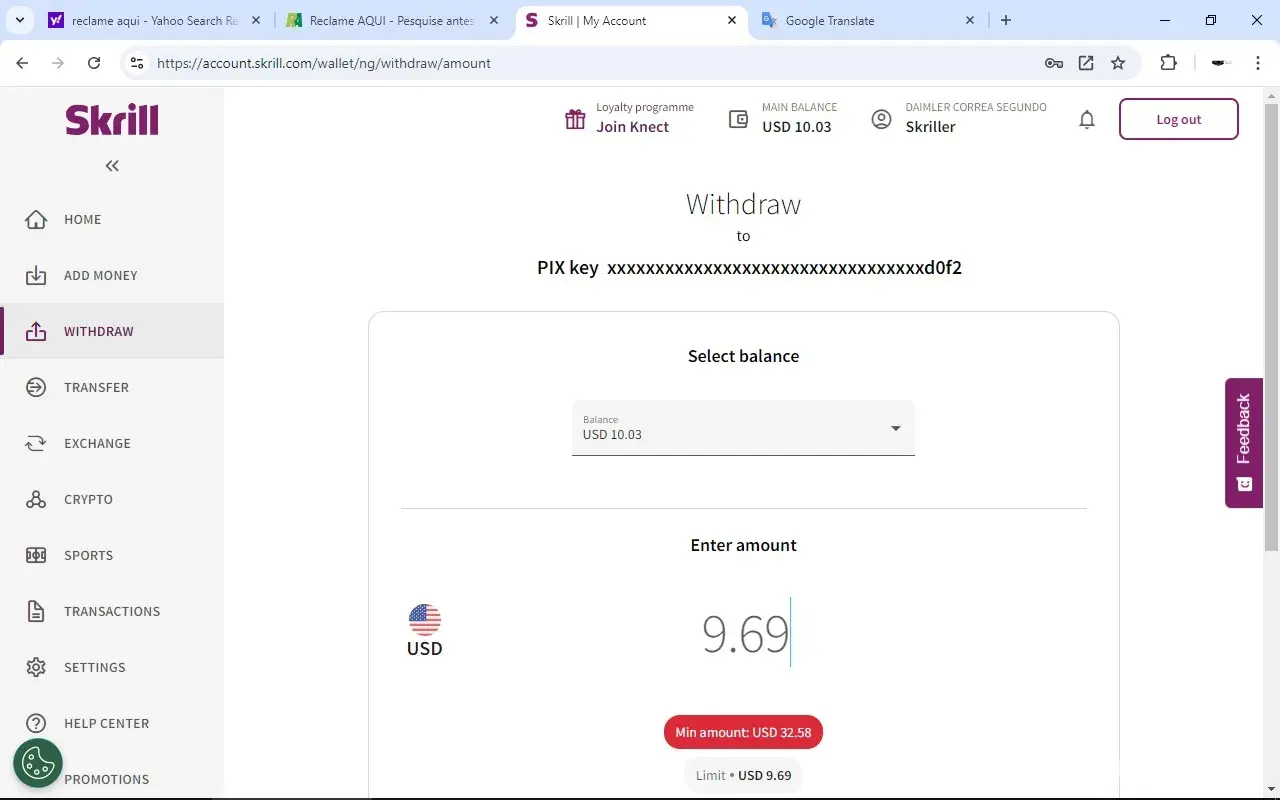 Withdraw of money on skrill.
