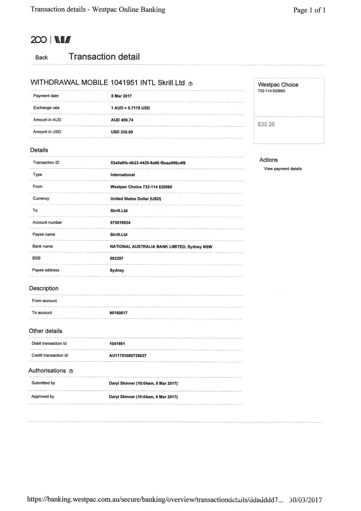 My Client Number is [protected]. On the 3rd Feb 2017 I attempted to Deposit $330.00 into my Skrill Acct to populate my Tesler Trading acct. This money has not shown in my balance. Again, on the 8th March 2017 I deposited $459.74 into my Skrill acct once again this does not reflect in the balance of my Skrill Acct. The money was sent on both occasions through Westpac Bank in Australia. Acct Numbers and Bank Sub Branch numbers are on the two attached transaction records from my bank. The desirable out come for me would be to see the total amount of $789.74 added to my Skrill account so I can then populate my trading account as this unseemly delay is costing me potentially thousands per day.