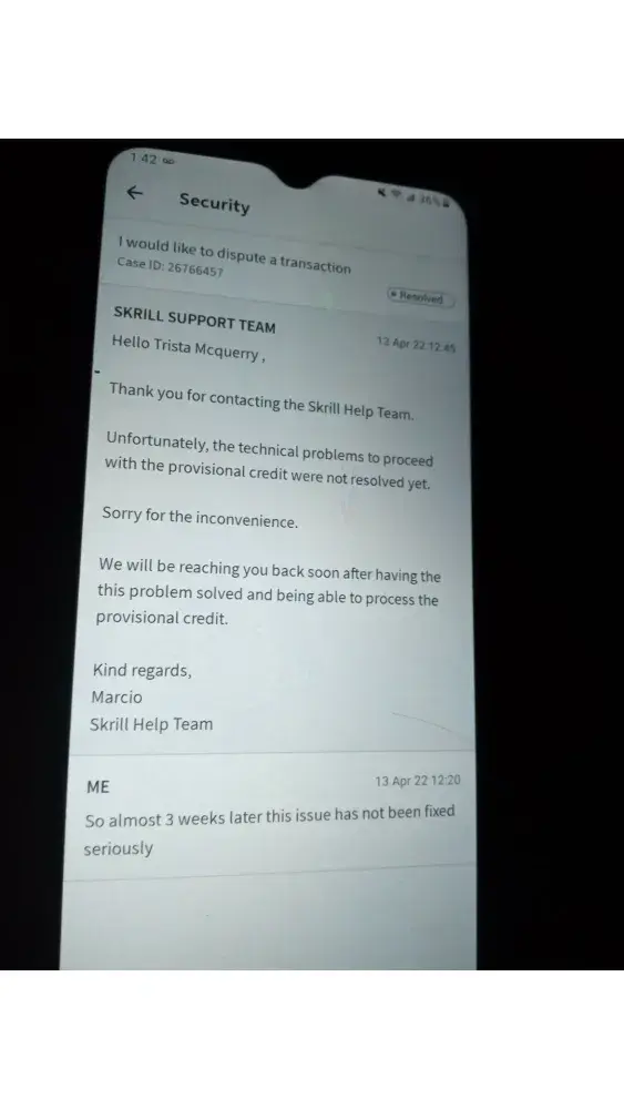 Desired outcome: Even without solving issue my complain marked resolved wretched services at all from skrill.
