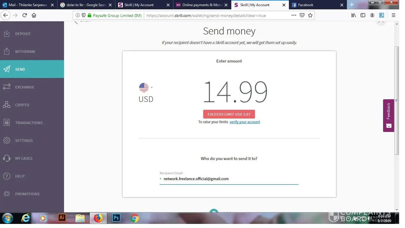 Yesterday I was checking and put a note on Skrill Instagram about seeking help to withdraw amount from Skrill account. Some person appeared with user name as chaklogg and convinced me to send money into his/her Skrill account so that he/she can transfer the money into my paytm wallet. I agreed as the person messeged me in my native language. Fund I transferred to chaklogg@gmail.cpm. It was about 9.44 dollars which I lost. The person is not responding to any of my messeges today. He changed his user id today as all_getit.. Name of the person in my account is reflecting as Tarandeep Kaur.