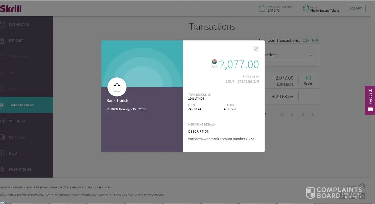 A payment of R2077 was made from my Skrill account into an account ending in 263.