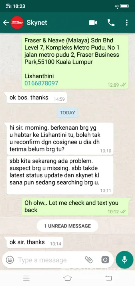 I have sent one parcel(kurtis) to my customer lishantini 27 AUG 2018( MORNING) from TANGKAK SYNET.Then after couple of weeks, Skynet staff from KL was contacted my brother and told that the parcel was missing and ask for the kurtis picture thru watsapp.Till now there is no responsed from Skynet and customer said she didn’t received and ask to refund money for the items. Can u take action on this and refund the money to me or return back my parcel.