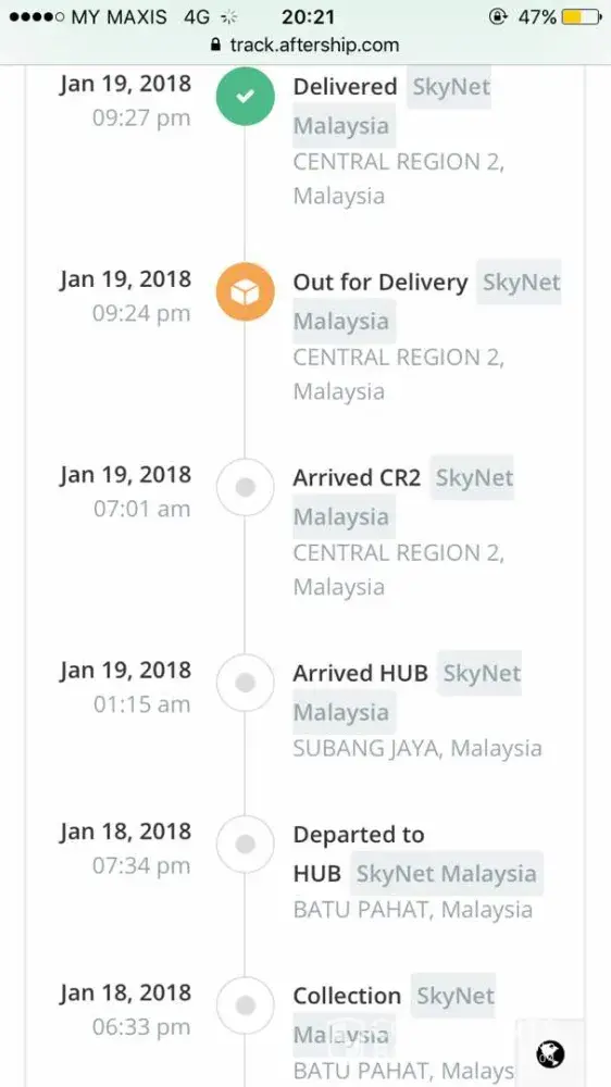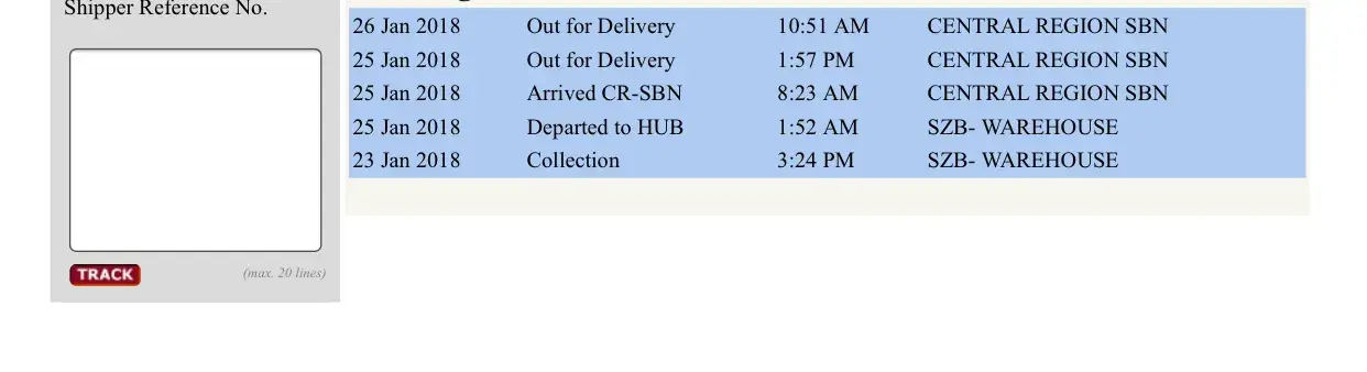 No staff pick up phone since they are working from 9am until 6pm. 25 Jan said out for delivery, today 26 Jan also said out for delivery, finally no delivery at all. Address is completely but parcel still cant reach my home address. Last week also facing this problem. Especially for Skynet Parcel Tracking No. [protected], very bad experienced, before 2nd times delivery i try to call Skynet to confirm the delivery status, staff said already out for delivery, but I dint receive any parcel on that day, I need going to branch to collect my parcel without any notice or call! When I reach there, I waiting for 2 hours!
