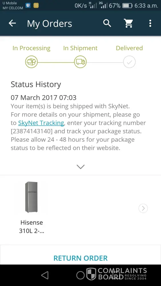 Tracking no: [protected]. Today, 11 march is the last day delivery for my refrigerator(refer tracking number). When i check the tracking number, it has been delivered to mistransit start on 7 march but i do not received any call regarding this problem. This is not the first time it happen. The price is expensive but not standard with the delivery service. I hope this not happen in the future. Please take any action as soon as possible. Tq