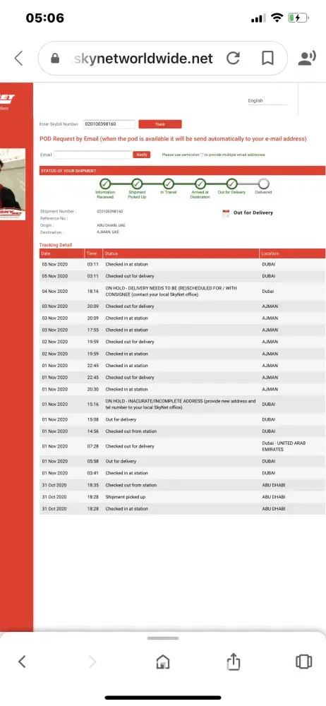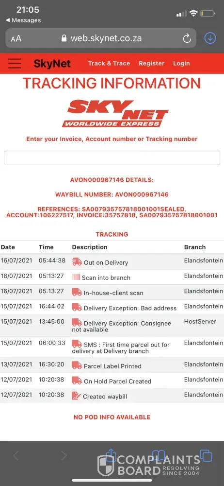 I sent complaint to Skynet website and they never monitor and reply after 3 weeks later. I sent complain to their facebook. The first replied is based on our record, your item has delivered successfully on 4 Jun 2021. This showed they not even has SOP to check properly and response to customer. Subsequent replies, we are still working on it. We are working with the related branch and have yet to receive any positive feedback and appreciate your kind patience & understanding.