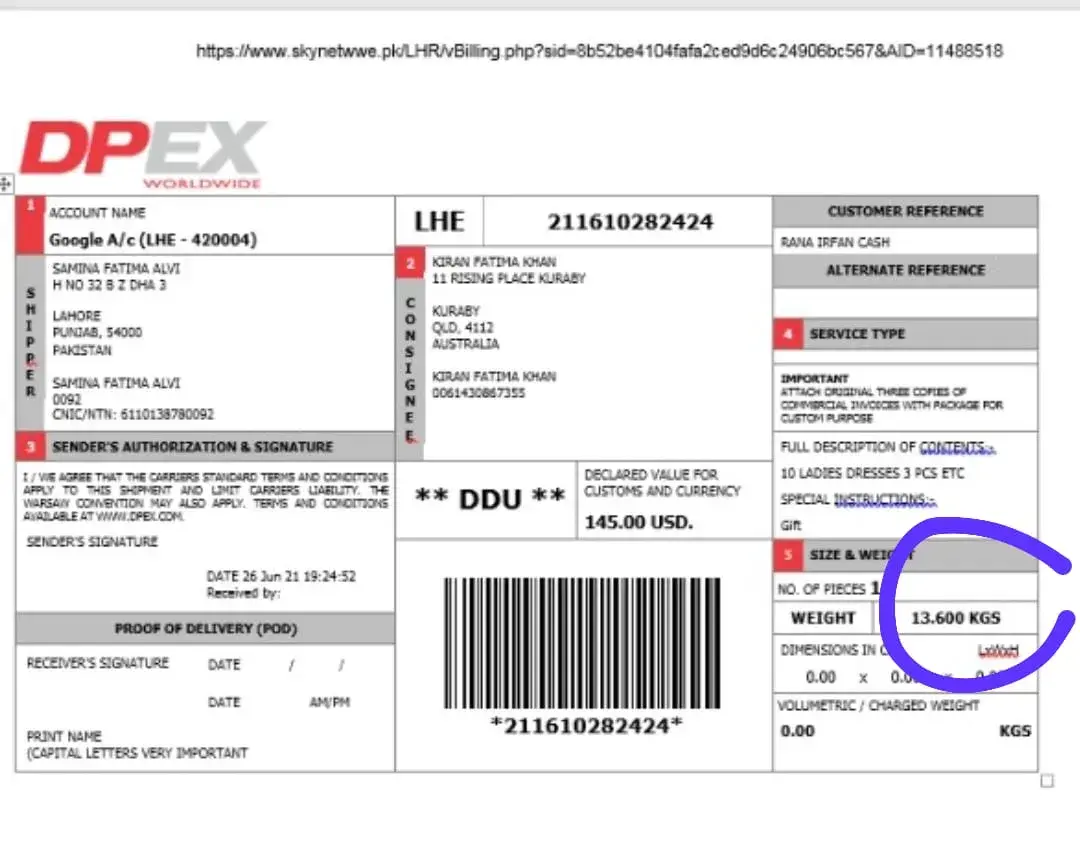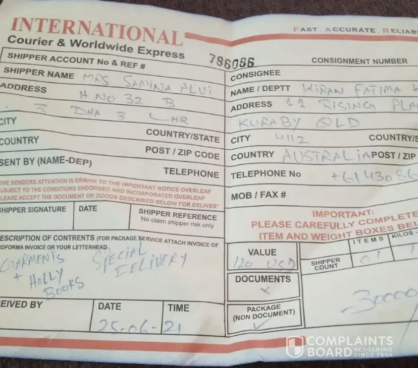 Sender has been charged for parcel 13.5 kgs but it was 11kg when received at the destination & 1 suit (white shirt & trouser with royal blue dupatta) was missing