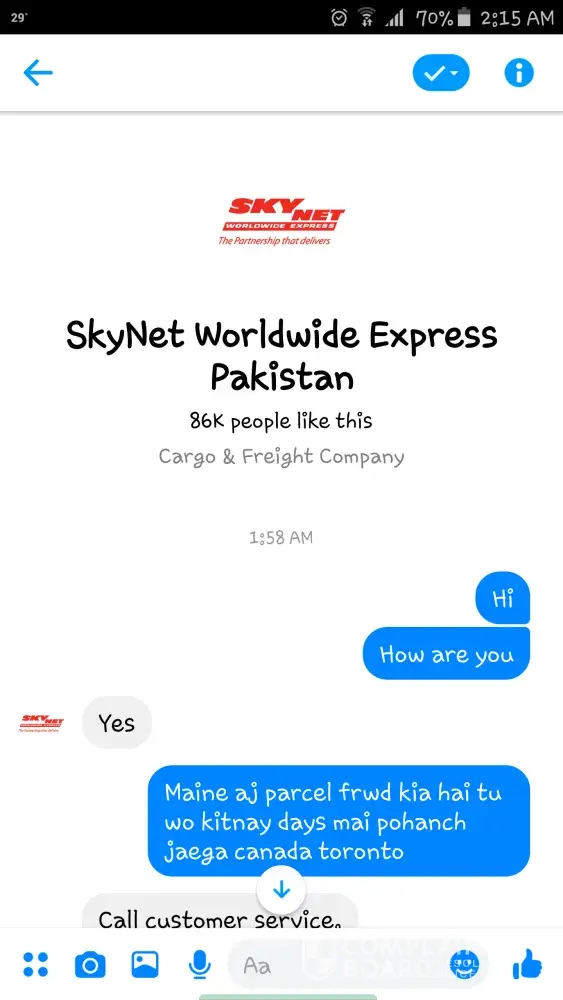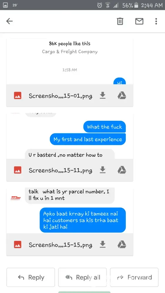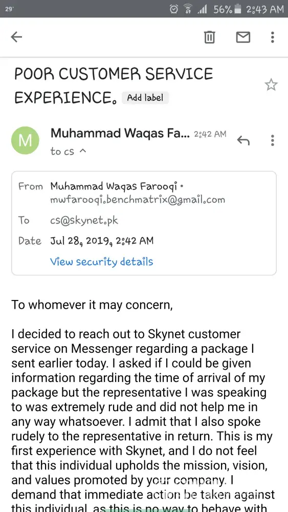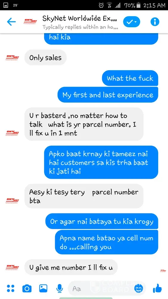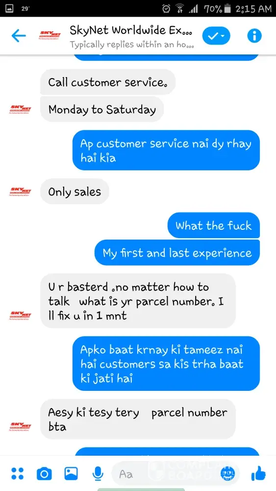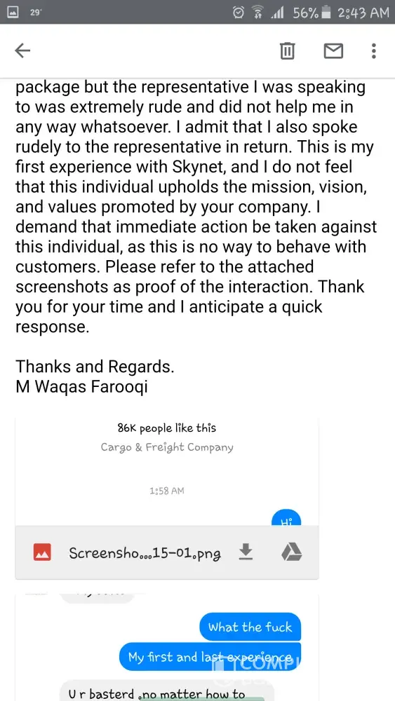 I decided to reach out to Skynet customer service on Messenger regarding a package I sent earlier today. I asked if I could be given information regarding the time of arrival of my package but the representative I was speaking to was extremely rude and did not help me in any way whatsoever. I admit that I also spoke rudely to the representative in return. This is my first experience with Skynet, and I do not feel that this individual upholds the mission, vision, and values promoted by your company. I demand that immediate action be taken against this individual, as this is no way to behave with customers. Please refer to the attached screenshots as proof of the interaction. Thank you for your time and I anticipate a quick response.