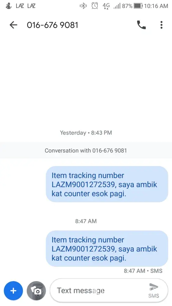 On 7 August 2019 8.43PM, I sent sms to 016-676 9081 skynet Cheng to inform I'll pickup my item at counter. (LAZM9001272539).