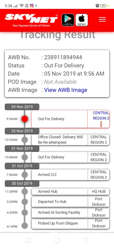 Pada 4/11/2019 alasan yang skynet Chan Sow Lin beri ialah driver Tak lalu di alamat tersebut. Pada 5/11/2019 masih belum terima parcel Dan alasan yang diberi ialah driver Tak sempat hantar.