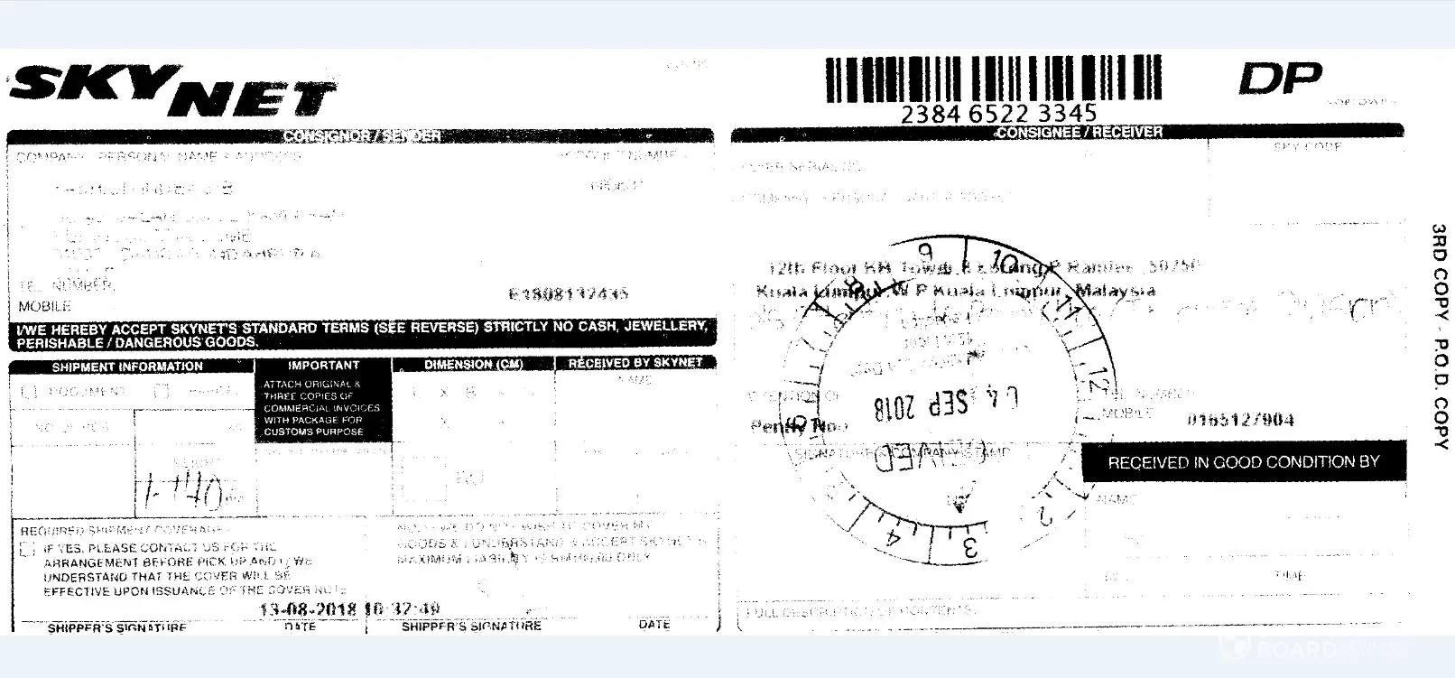 As I tracking my parcel today through online, it showed my stocks ard delivered. However, when i ask and check with receptionists, they told me they didnt received any parcel from Skynet. And, I called skynet customer service, the officer told me my stocks are delivered, but cant provide me the name who received my parcel, and say the record only show received the company chop from reception on the parcel delivered.