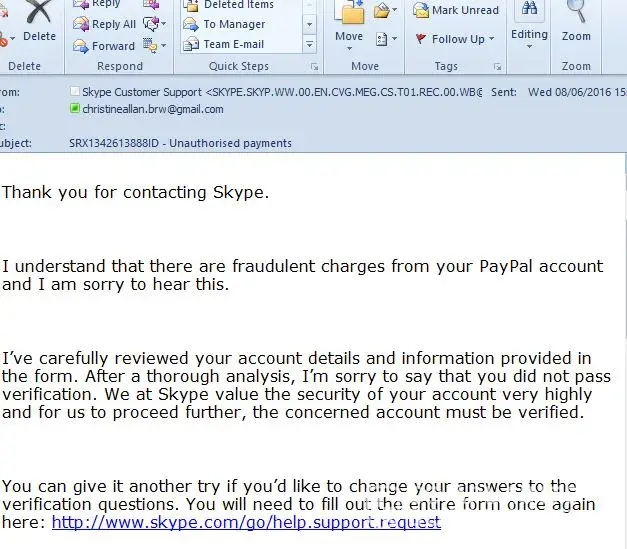 I recently received an email saying that my account was suspended due to unusual activity. I have tried to get it reset using the online form, however, every single time I submit the form I get an email stating that I have not passed the security check. What baffles me is that this is in the form of an email, sent to the email address I used to set up the account. When I query this, I get sent a link to the online form to fill in again so I can fail the security checks yet again. (I suspect my account was hacked and information changed). I was told on one occasion to set up a new account. I then asked about my credit on the locked account ( which is only a couple of pounds, but it is still my money) and was told it would remain there until I got the account unlocked, which I can't do because Skype doesn't believe I am who I say I am. At this point I began to feel that customer services were not listening to a word I was saying. I was happy to cut my losses at this point, but Skype had other ideas. Every single day since then, I have received an automated email titled Auto recharge suspended. I never signed up to Auto Recharge so find it annoying that it was on my account, but the daily emails are like a dripping tap to me. I filled in another online form asking them to stop sending the messages, but received the standard reply that I failed security checks so they can't do anything to my account. I messaged back saying I don't want them to touch my account, just stop the messages. I was completely ignored.
