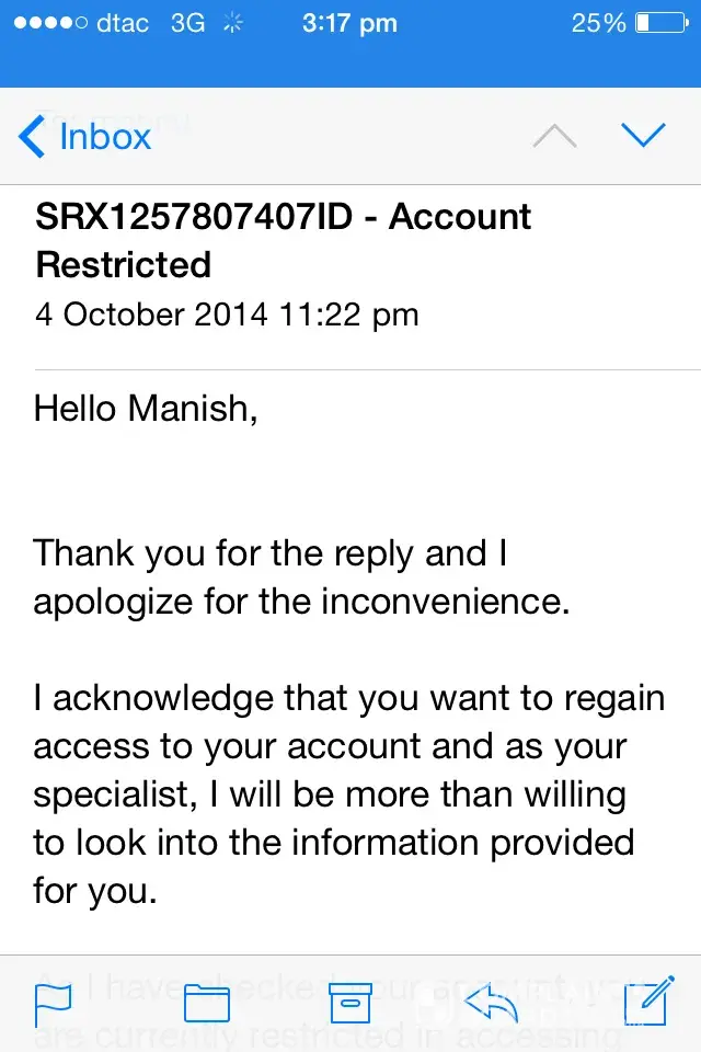 After a lot of to and fro emails (they will reply once every 1-2 days) and now it has become reply once every 2-3 days from their end. They said that they will escalate the issue, but no timeline promised. After a few more emails, they said that the person assigned is unavailable. After few emails and few days, they wanted my mobile number to talk to me, then again no calls and no responses and they said they are again investigating the issue and nothing happened so far for 3 weeks.