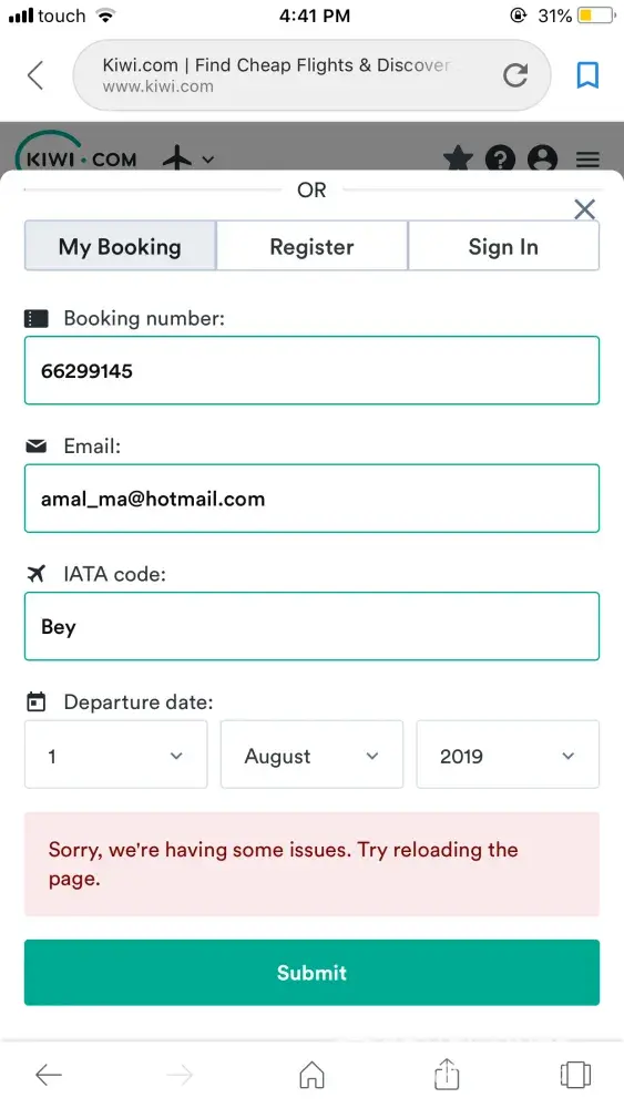 i am entering my booking number as printed on the kiwi.com page and being told that "it doesn't exist" .