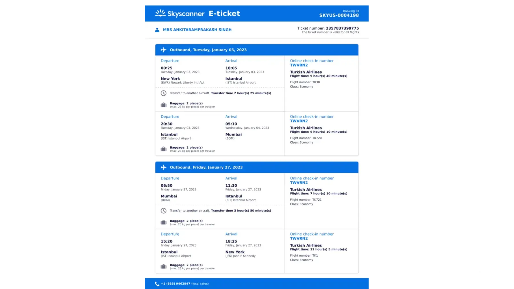 I had booked round trip from US to India on Jan 3 to Jan 27 using Skyscanner website. My e-ticket confirmation SKYUS-0004198 and my reservation was TWVRN2.