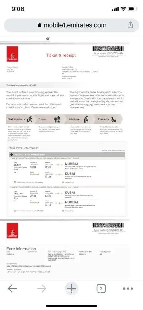 Emirates Booking Ref: HKT4QS