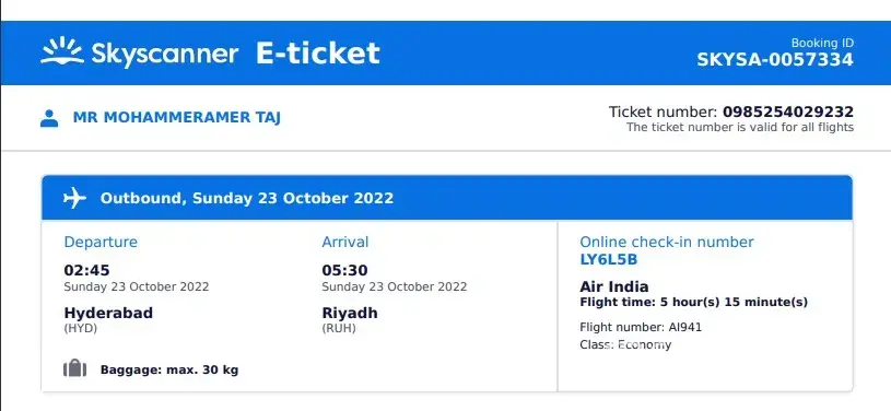 The ticket I booked with Skyscanner
