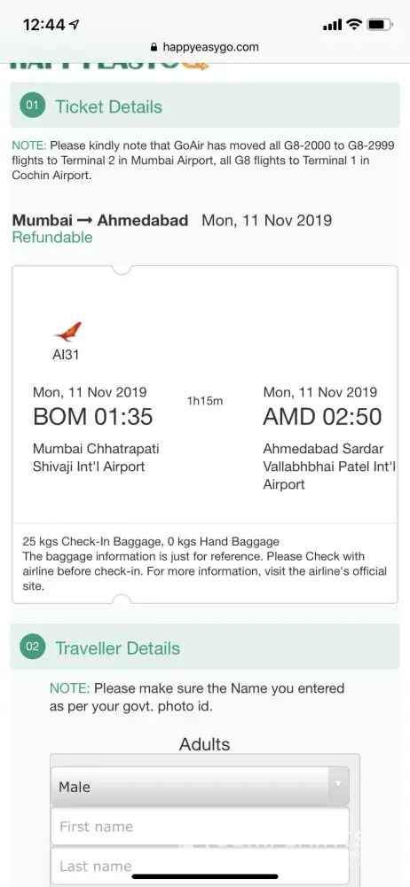 We have booked flight tickets on 'Happy Easy Go' on 26/08/2019 after being redirected from SkyScanner India; as they were showing cheapest tickets from London to Mumbai on the website for the day 07/11/2019.