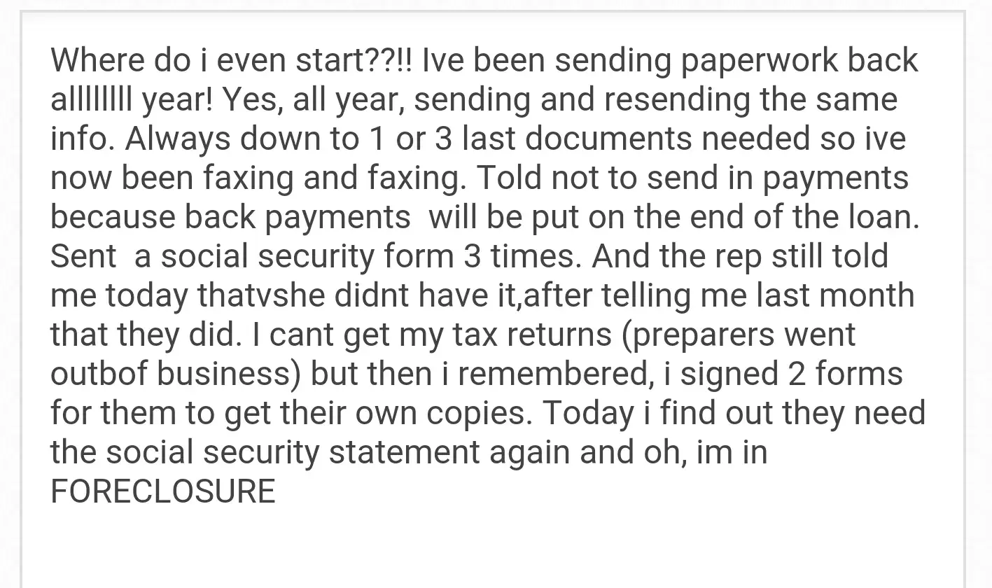 Im totally exasperated with this company! back and forth with paperwork, phone calls, more paperwork. I tried to make a payment and it wasnt accepted. yesterday I find out im in foreclosure! very depressing,