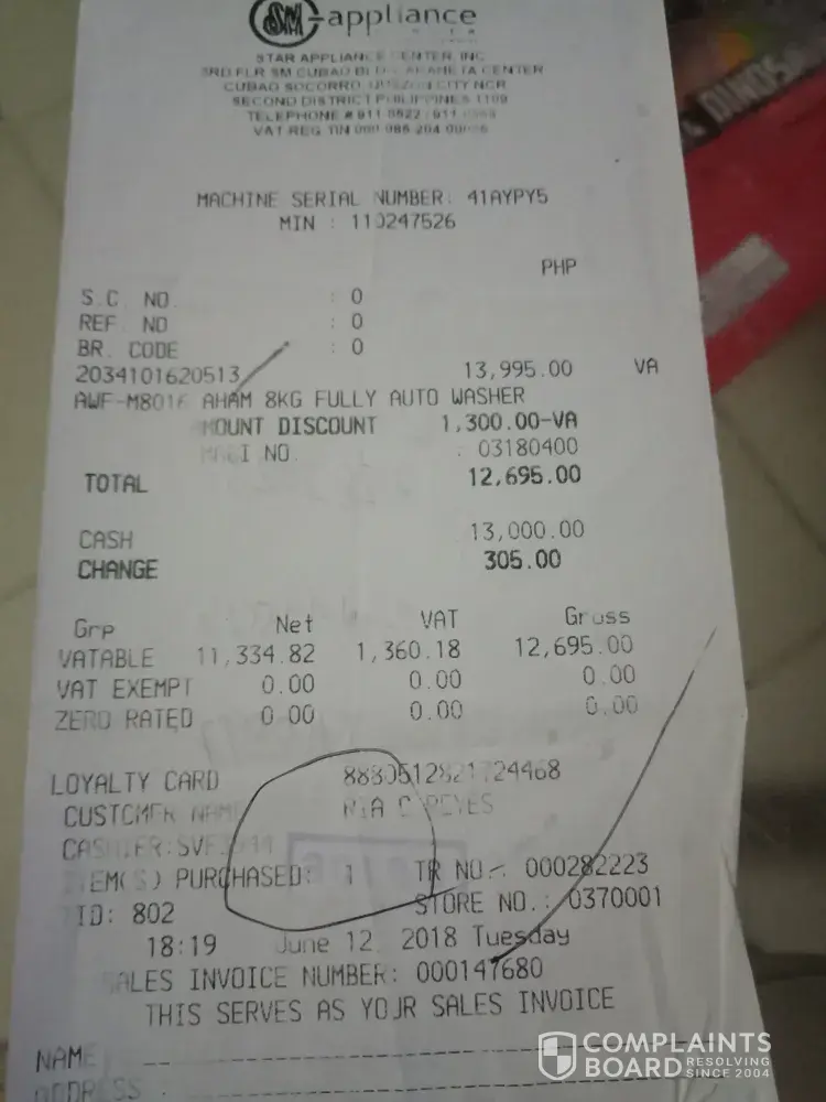 We bought a washing machine for us to be convenient in using it even without high pressured water. Because we cannot use our automatic washing machine due to no water here in our community. There were so many appliance ctr near us but we preferred to buy at sm appliance ctr because we knew it is always in good condition... And as always we were happy on what we got there. So last saturday may12, we decided to buy a washing machine. We tested the motor and works well... Then they signed me a paper that it is tested. We picked up the product because I really need it. When we arrive at home I used it right away then I noticed that there was a water flowing on the edge of the washing machine, when I drained the water, we saw a 5 inch crack inside the tub! We wipe it immediately and let it dry... On the next day we went back to sm appliance ctr marilao and I expect them to replace the item right away. When I talked to the sales man he said they cannot replace it and then I talked to the higher supervisor, she said they need to ask the manufacturer (american home) if they will approve before they replace! I didnt expect what she said to me... It was a hassle for me... A waste of time! Now can I ask somebody? Was it right to refuse my request for replacement? I feel like im rejected, not contented and so annoying in what happened to me... Please help...