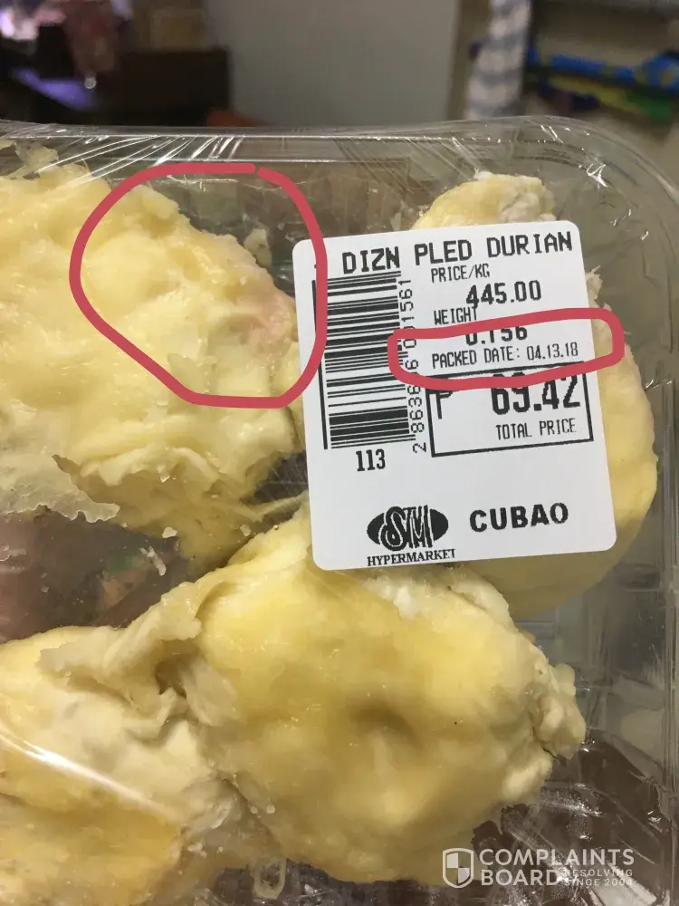 My husband bought a pack of durian fruit from SM Hypermarket Edsa Main just this afternoon. My daughter and my husband started eating it when my daughter complained that the fruit tasted weird like plastic. When my husband tasted it, he realized that something's wrong with the fruit and told my daughter to stop eating the fruit. My husband let me tasted the fruit and told him that the durian tasted like a spoiled fruit. Usually that kind of taste of durian was frozen, then it was not properly handled and was exposed to sunlight - this makes the durian spoil. Also, we noticed that the packed date was dated April 13. Which is the date tomorrow since it's only April 12. This made us more concerned as this is actually luring your customers saying that it's a fresh product but truthfully it's not. My husband decided to go back to your branch and spoke to the supervisor. The staff apologized and informed my husband that they can't replace the product with the same item. Hence, it was replaced with packed mixed fruits. It is no problem for us that it was replaced with a different one. What we are concerned of is the fact that the packed date is not true and the supervisor is saying that it's only a system error. How can there be an error if you are dealing with food and this is very crucial to your customers?! Food is not a joke to consumers and your business is actually to serve your consumers. I am not taking this lightly as I have a 1 year old kid as well. I hope that this will have your immediate attention as this report does not only concern me, but all the consumers as well. This is actually faking the dates of your products so we, consumers can buy your spoiled products. I believe this is not an approved process by our government agencies that concern the safety of the food that is sold in the market.