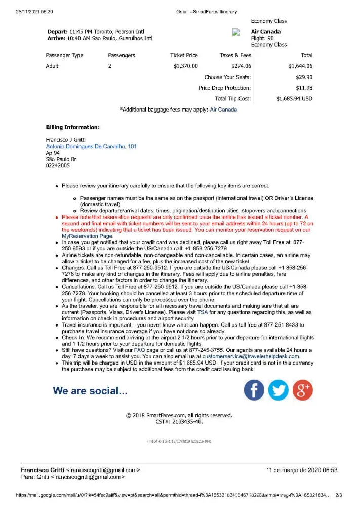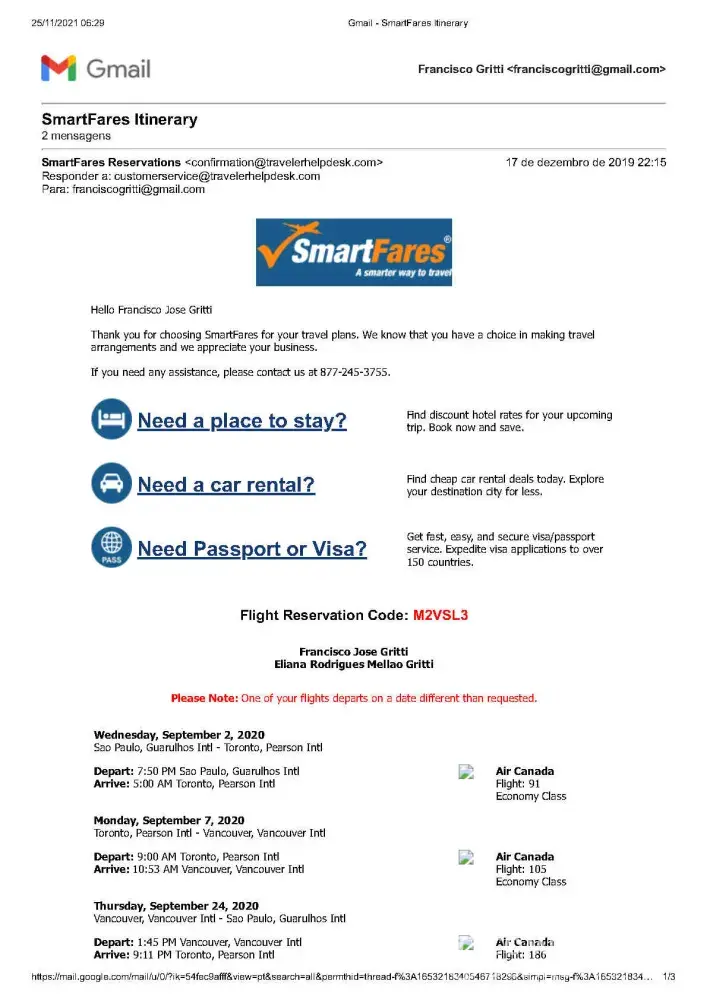 In December 2019 I´ve bought tickets to fly from GRU (Sao Paulo/Brazil) to Vancouver in September 2020.