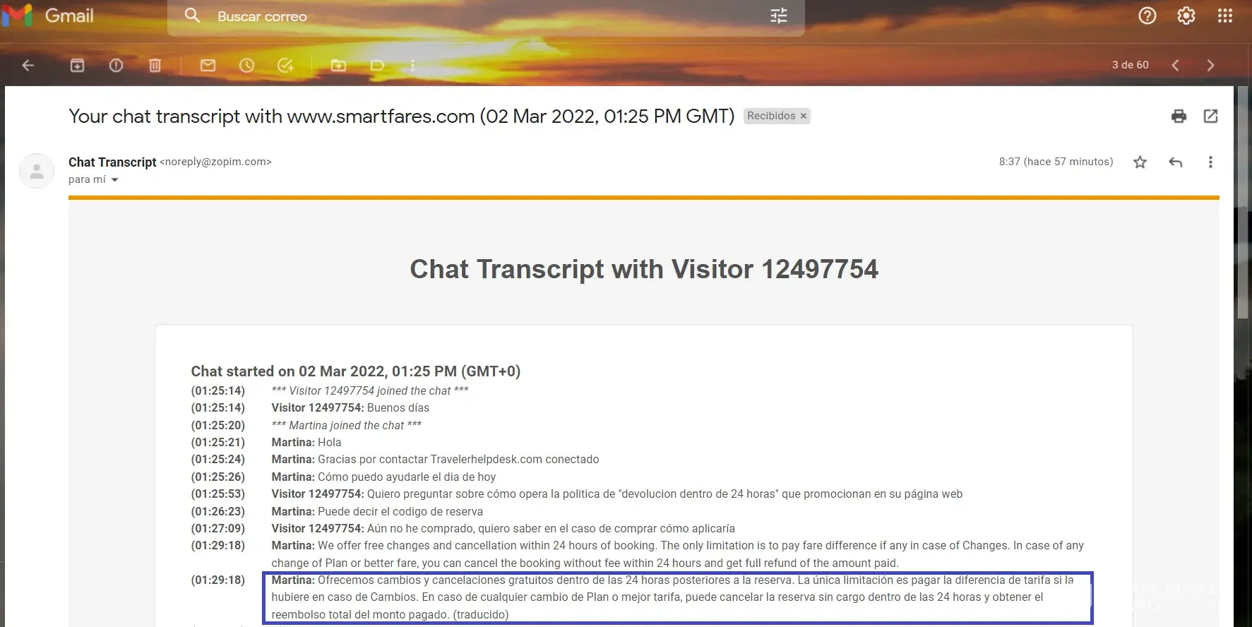 3. Chat transcription of their "Free cancellation within24 hours" in a chat with a customer support agent when I asked the details about it, it is in spanish language but it confirms that you can get a total refund of your charges within 24 hours of purchase without any other requisite.