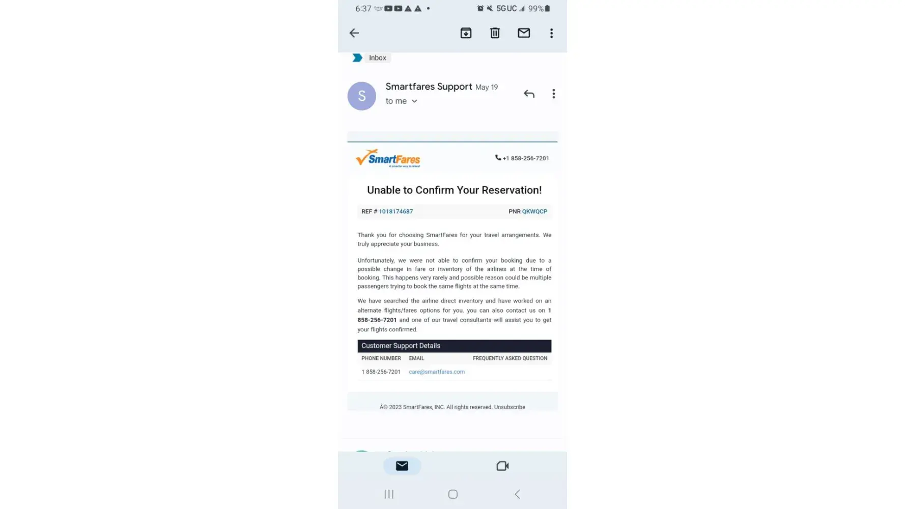 On may 18th, 2023 i booked a ticket same day got an email said spirit canceled my reservation i called spirit.com spirit say not them. Smartfares.com scammed me never refund my money everyday say 24hrs should get my money refunded it's been 15days nothing yet.