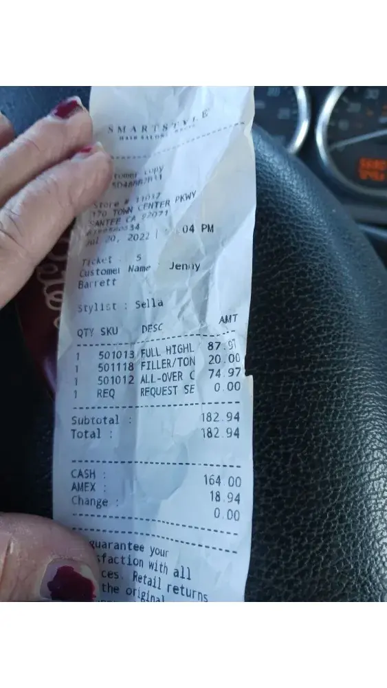 On May 11, 2022 I walked into smart style hair salon/ Walmart in Stephenville Texas, the lady (Ashley) said she can do my hair when she was done, I said great. So when I told her what I needed and showed her a picture of she said no problem. I asked her how much she it depends on how much work she had to do. Now my hair already had highlights and lowlights in it she just had to follow it, there was another lady there also, they were talking about what to do with my hair, now I didn't ask for any other services just to fix my hair and blend the blonde highlights to my grey that's all. When the other lady left , Ashley said that she loves to play mad scientist with hair color😳 so now she stripped all my brown hair out, and I thought she was going to put brown back in but she didn't. She told me she mixed 9 different colors to do my hair , I said really why, so she could get the color she wanted. I thought its what the customer wants ? So now 2 1/2 hours later my head is completely BLONDE not what I wanted at all ! Then she tells me my hair was very dry yeah because you fried it , she said I need a mask for my hair I said ok