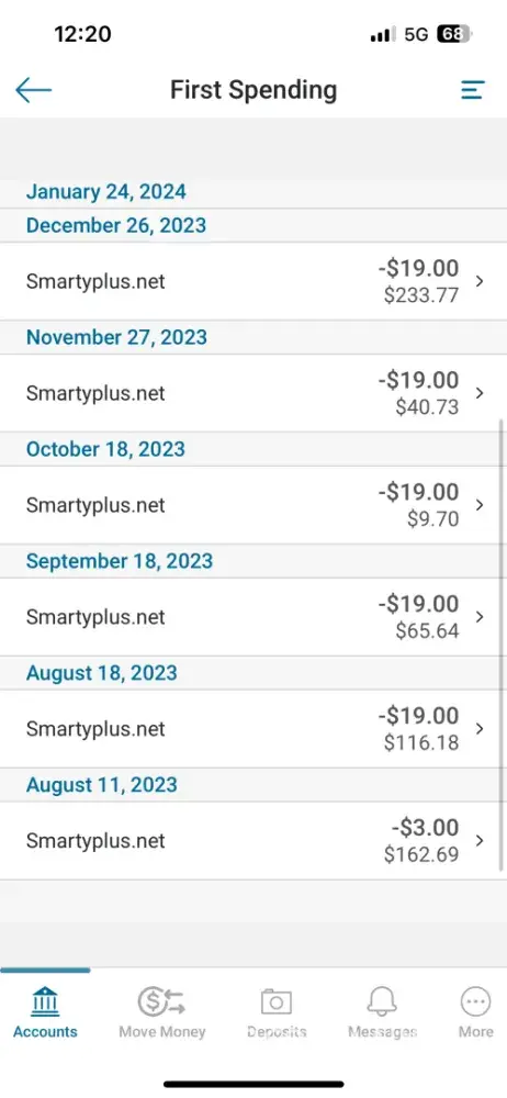 I have had five $19.00 payment taken out of each of my checks since November and have never noticed and I didn’t even know what smartyplus was untill I looked it up on Google to resolve my problem. I never made an account so there is no way of cancelling this payment. I would like all my money back plus the $3 taken out also.