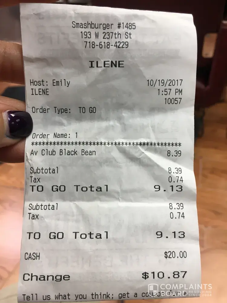 This website is not directly affiliated with Smashburger so they will likely not see your complaint here. You will want to contact them directly as soon as you are able.