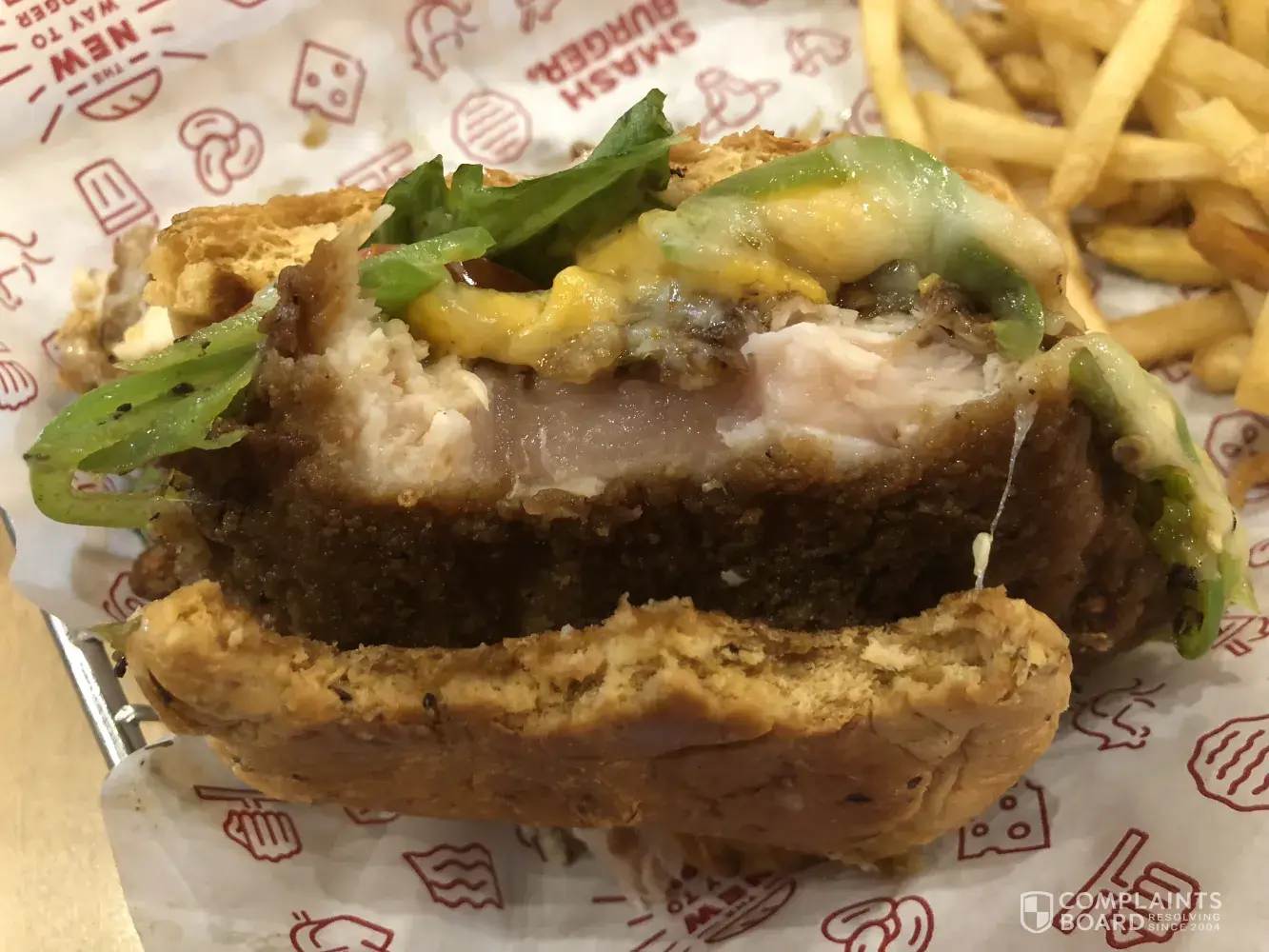 After several attempts of calling to the Smashburger customer service center and recorded messages on voicemail, it never got answered and returned the call. So I want to file the complaint here via online. On November 29th, 2017, I went to my local Smashburger restaurant to order "Colorado" crispy chicken sandwich. I ordered it then waited for about 10 min which is very normal. After my first bite of the sandwich, I suddenly noticed a raw chicken meat. I tore the sandwich apart in half and revealed that most of inside the chicken meat is still raw. I showed it to the shift leader guy, Jason. He was like oh sorry about it and did nothing afterward. I was expected to get full refund or coupon for free meal but nothing! I feel like the headquarter need to know about this but don't understand why they went being unresponsive and helpless? My words must be heard in this kind of situation of serving a raw chicken to customer. I took pictures of my meal as evidence.