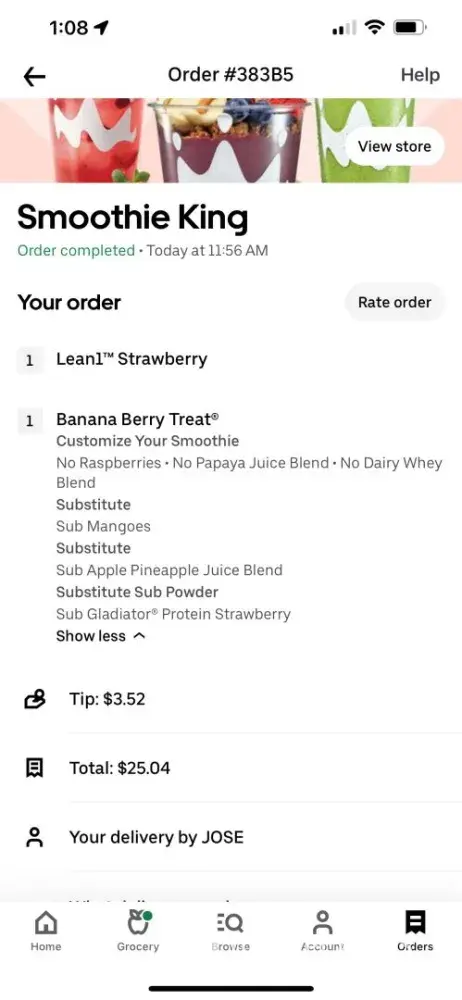 I ordered two smoothies from Smoothie King at 3375 Sugarloaf Pkwy in Lawrenceville, GA through Uber Eats (Order #38385). As a loyal customer of over 15 years, I always order the same Banana Berry Treat with a substitution for raspberries, and my husband gets the Strawberry Lean smoothie, both in 32oz sizes. This time, the order was delivered with a 40oz smoothie that appeared to be vanilla and a 32oz strawberry-colored smoothie. I questioned the Uber driver about the size difference, but he confirmed he delivered what the store provided. My husband and I work remotely, so he took the 32oz smoothie (strawberry-colored) to his office without further inspection. I called the store to report the issue and spoke with Jordan Watkins (who stated he was the supervisor), who was extremely unprofessional. He claimed that he "did me a favor" by upsizing my order to 40oz, which I never requested. He also argued that I didn’t ask for bananas in my smoothie (incorrect, see attached order), despite my clear instructions to substitute raspberries with mangoes. No one informed us about the changes, nor was there a note or receipt explaining the alterations. When I asked for a refund or the option to return the incorrect smoothie, Jordan refused, insisting that the 40oz was my husband's Strawberry Lean (vanilla-colored), which it clearly wasn’t. He repeatedly interrupted our conversation to assist other customers, making it clear that my concerns were not a priority. He also refused to provide a contact number for headquarters and claimed he was also the GM, implying that no further action could be taken. I’m deeply disappointed by this experience. I paid nearly $12 for a smoothie that I couldn't drink due to their error. I expect better communication and customer service, especially as a long-time customer. I’m requesting assistance to resolve this issue, as it’s unacceptable to receive such poor treatment and incorrect orders without any effort to make it right.