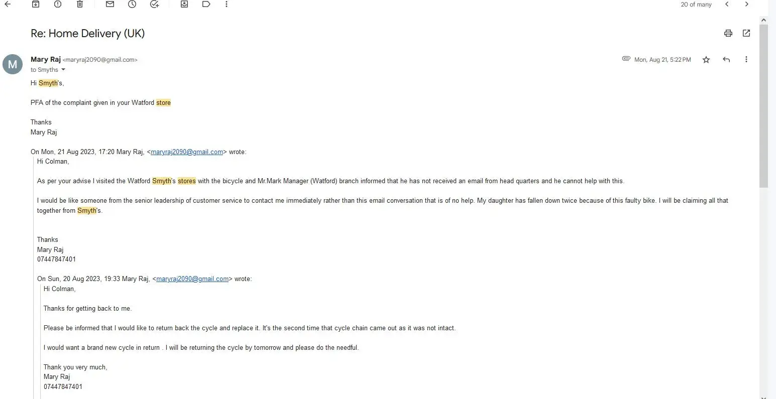 I am extremely disappointed with my recent experience at Smyths Toys in Slough, particularly with the conduct of the duty manager, Delroy. I visited the store because my 5-year-old son's scooter (bought only 40 days ago for his birthday) has a clear braking fault. Two staff members, Jordan and Ty, both confirmed that the scooter was faulty after asking my...