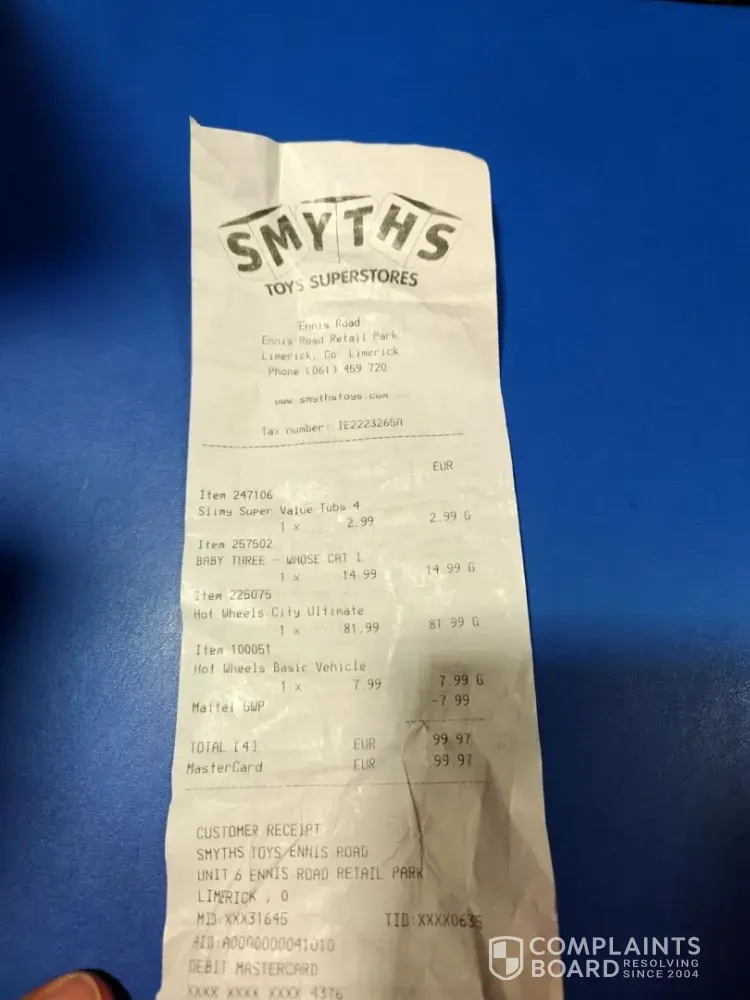 The Issue On April 4th, at Ennis Smyths Toys Store the Hot Wheels Ultimate Garage item was clearly marked on the shelf for €66.99 (Pictures taken). Due to a system error, I was charged the "old" price of €81.99 at the till. I did not notice the discrepancy until reviewing the receipt later. To confirm the error, I returned to the store today and noted...