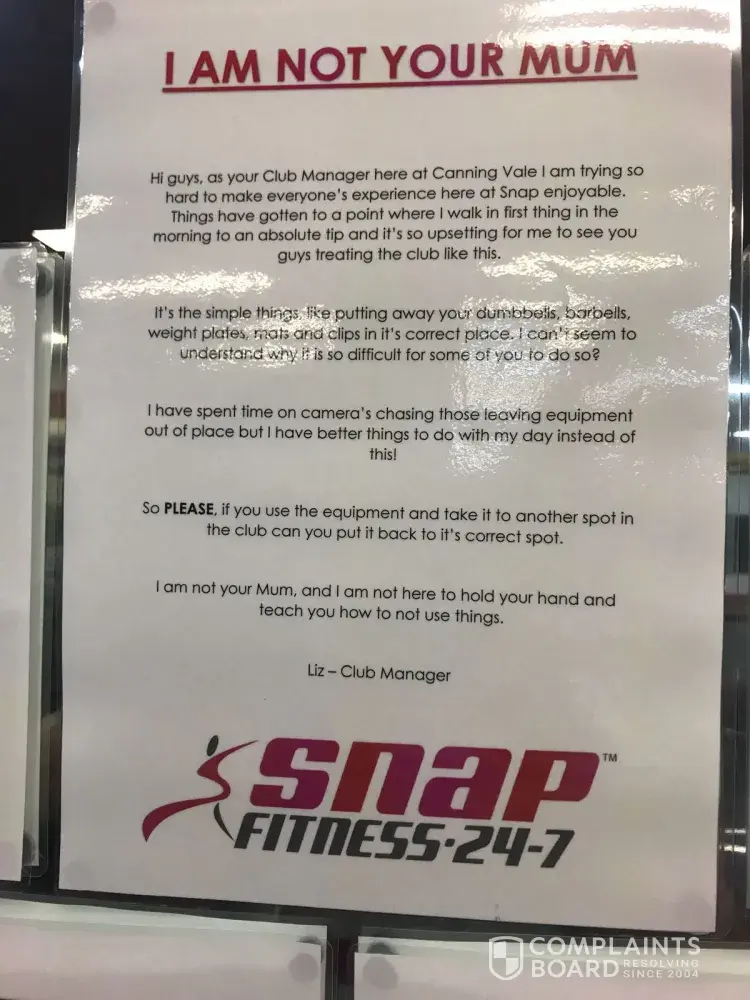 Good evening my name is Rohit and I am the member of snap fitness canningvale wa Australia .I am writing this mail to give you attention for this Branch .lot of my friends with me planing to quit this gym because of discrimination and bad behaviour of staff with our Indian community we are more than 30 members specially the gym manager Liz she do gossip with her mates in gym and don't her mates don't let anyone to use machines if we ask them again then she help them to make arrangements with us we having bad experience with this club and using unprofessional posters on mirror so please fix this problem asap otherwise we have to leave this gym I m attaching some pictures as well for posters on mirror