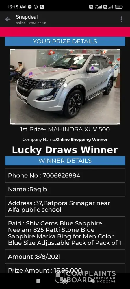 I got message from snapdeal that I have won prize in lucky draw from snapdeal but I didn't get prize and the prize was mahindra xuv 500 or 1960000 and snapdeal asked me to pay 6500 and I paid 7000 on behalf of snapdeal niether I got prize nor my money 7000 back snapdeal customer care and company employees are using bad language snapdeal is totally fraud license of snapdeal should be cancelled because they sell duplicate products at high prizes I request Mr Narendra mohdhi ji to cancel the license of snapdeal...