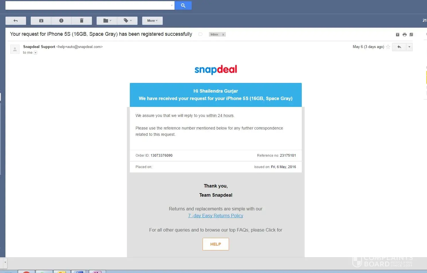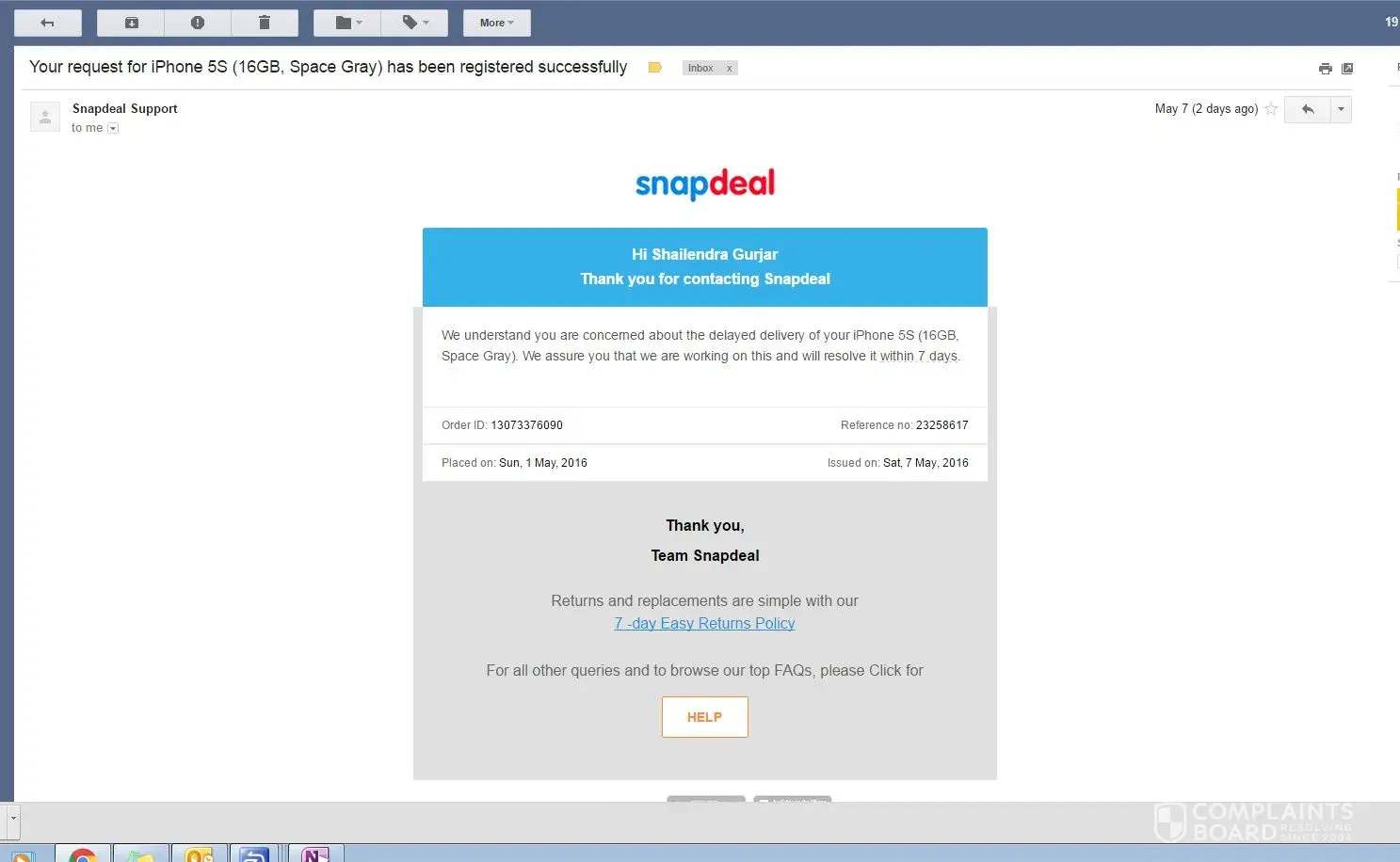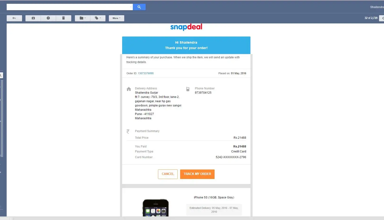 Order Placed on 1-May, IPhone 5S with snap deal.