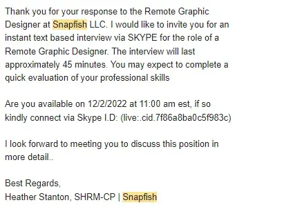 I was contacted by someone claiming to be Heather Stanton from Snapfish to interview me over Skype chat for a graphic designer job with Snapfish. I completed the interview and was sent a job offer. While fact-checking the information I had about Snapfish, I got in contact with Heather Stanton who said she was aware of someone offering this job using her identity and that it was a scam.