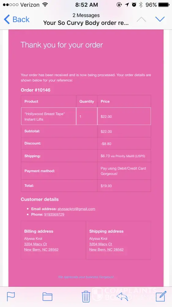 ***DO NOT ORDER, SOCURVYBODY IS A SCAM!*** Placed an order of $74.84 on February 22nd of 2017 which was withdrawn from my account by the next day. I only received an email with very limited information including what I ordered and an order number, but no information on tracking the order or login information and absolutely no information on how long they take to process and send orders. After a few weeks of not receiving any further emails with information on my order, I emailed them asking for information with no response. A couple weeks after that, I messaged them on Instagram where they responded asking for my name, I gave it to them, then again no response after that. A couple weeks after that I messaged them again asking what was going on with my order and they never responded. After looking at their Instagram page I noticed several people asking about their orders which SoCurvyBody responds asking for their order number, then deletes the customers comment- which I assume is to try and cover up any evidence of them being a scam. I have now filed an complaint with the Better Business Bureau where they already have a F rating. I have also disputed the charge with my bank and will do anything else I need to do to find this "company" legally responsible. I wish so badly that I had read all the hundreds of comments before ordering from So Curvy Body that I now see on websites like this. I have not seen a single shred of evidence that they have provided any product to anyone after an order. DO NOT ORDER FROM THEM! And if you already have placed an order and didn't receive product, PLEASE CALL YOUR BANK AND DISPUTE! THEY NEED TO BE SHUT DOWN IMMEDIATELY!