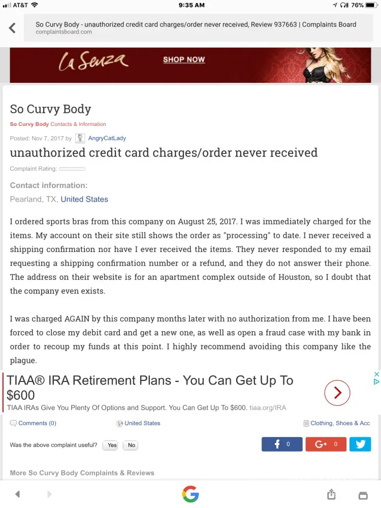 So Curvy Body’s earns a 1.0-star rating from 0 reviews and 23 complaints, showing that the majority of customers are dissatisfied with their purchases.