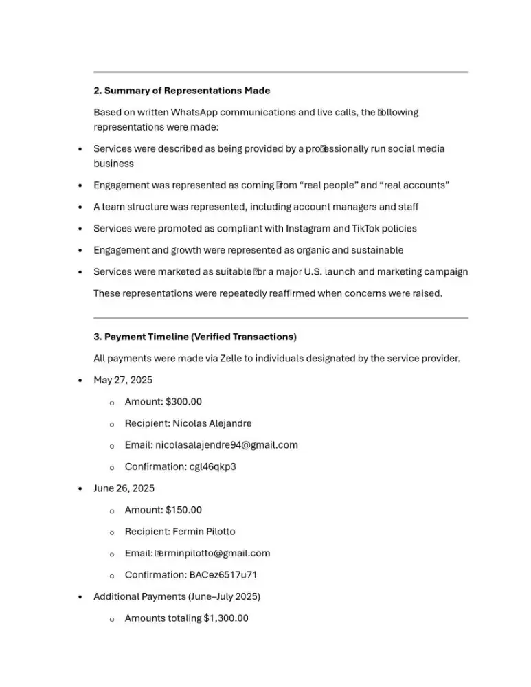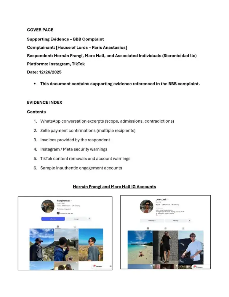 I am reporting an international service fraud involving misrepresented social media marketing services. I hired an individual and associated parties operating under the names Hernán Frangi, Marc Hall, and Sicronicidad LLC to provide professional social media marketing services for my business. The services were marketed as legitimate, organic engagement...
