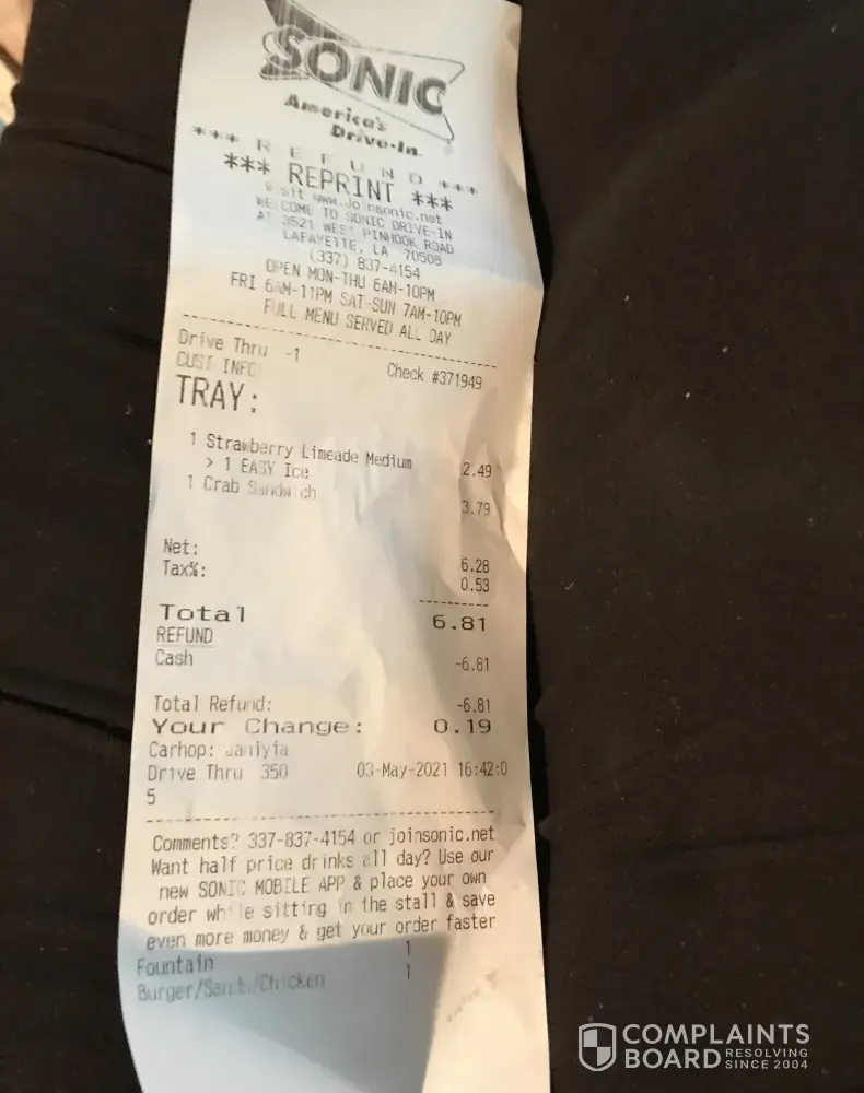 Sonic Drive - In ~ Pinhook Road, Lafayette/ Broussard, LA I was served a COLD CRAB 🦀 & SEAFOOD SANDWICH For $4.00. I circled the building & brought it back to the Window. The manager refunded my money. I am thankful for the refund during the hungry hour ~ HOWEVER ~ I WAS Ready TO EAT A HOT MEAL. Seafood is always served hot. I passed up a SEAFOOD...