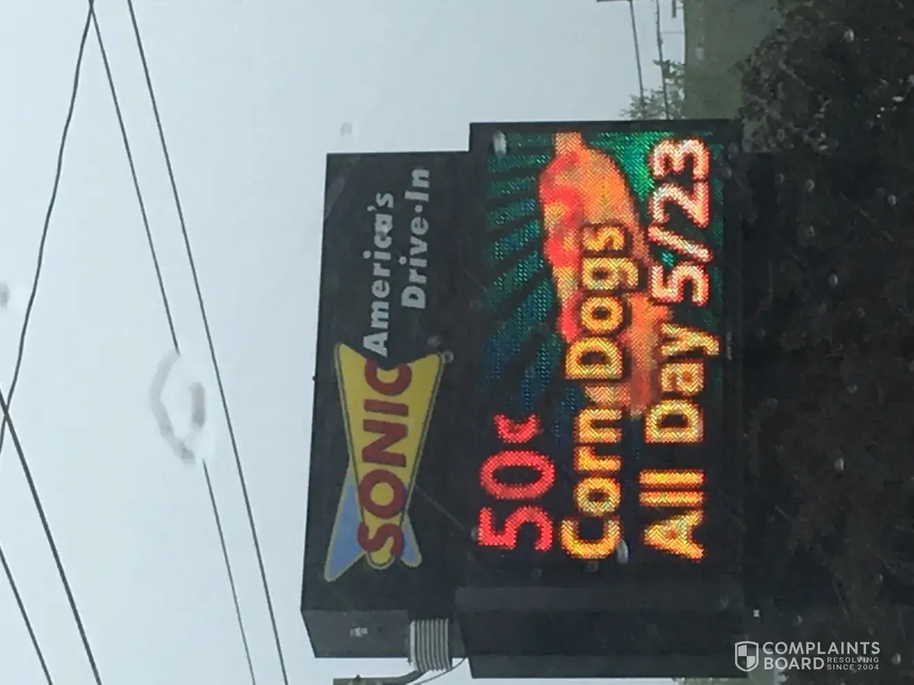 Marquee said $.50 corn dogs all day 5/2.3. No special day noted. It was raining super hard when ordering and I was getting soak and wet so I pulled around to window. The kid at the window was very dramatic when taking my money. I didn't hear him say how much. You've they charged $.99 each. Mgr said $.50 is on a certain day. She took corn dogs back and gave...