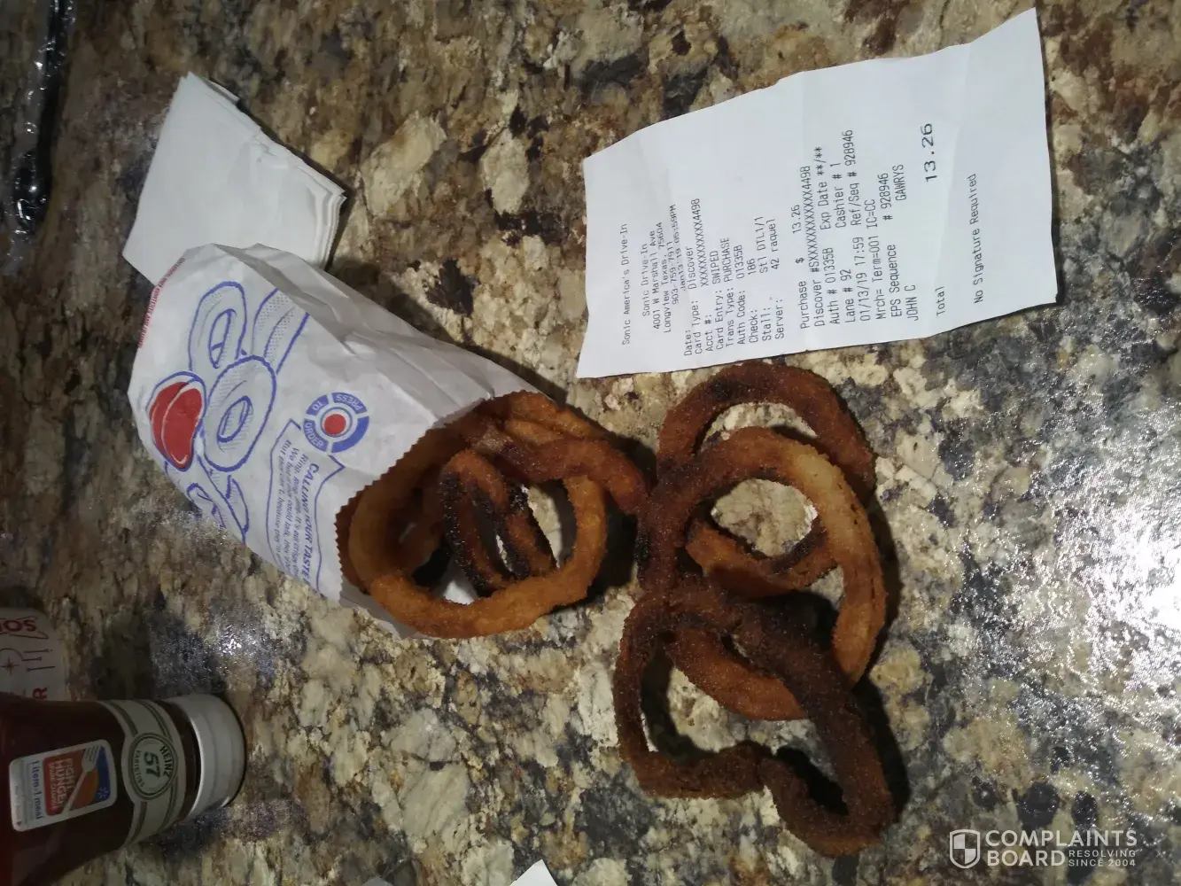 We stopped at our local Sonic. We ordered to Chili's, two sliders, and in order of onion rings. First no lights on the sign menu so we could not see what to order. We got our bags and went home. Opening the bag revealed burnt black onion rings. Opening the Chili's one was half full one was two-thirds full. The burgers we're not up to par either. We did not get an itemized receipt so I have no idea if I was charged correctly. A ver disappointing effort. Most of the food went in the trash.