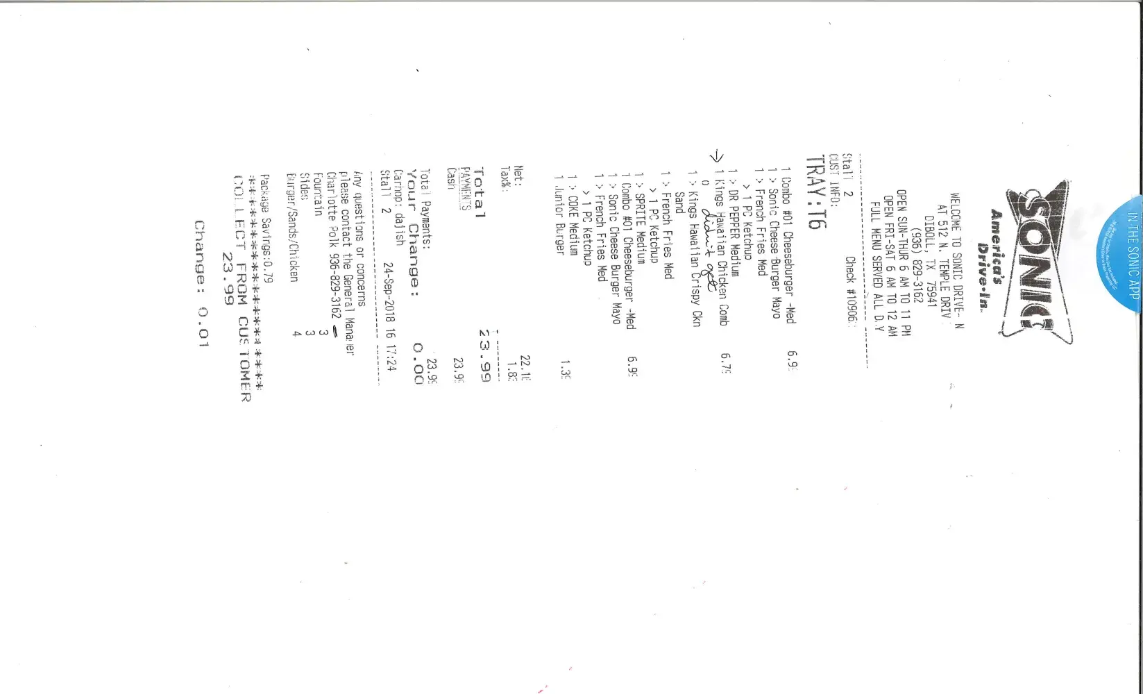 on 9/24/18, we made an order to go, drove off and drove for 26 miles before arriving home only to find that we did not receive all of order. Needless to say we didn't drive another 26 miles to just to pick up the item we didn't receive. The sad part is that my stepdad is under hospice and after not eating for three days, this was the first meal he wanted.
