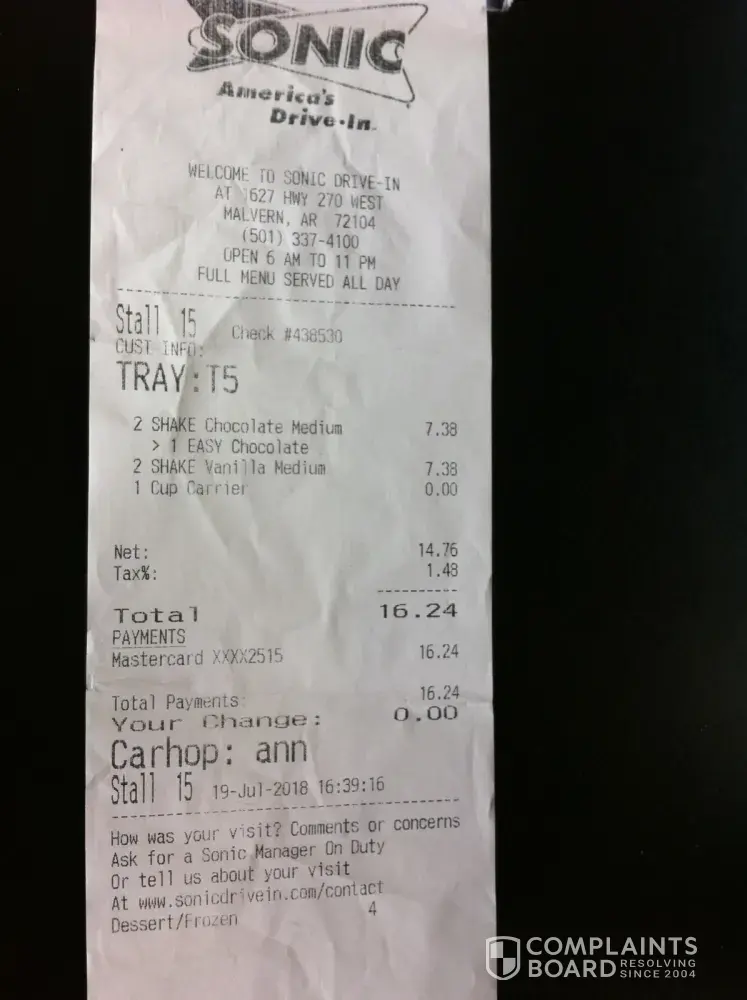 Ordered 3.99 special and got charged 7.57. Asked if the were still on sale and the carhoplooked at receipt and said um no it says 7.57. Called to ask if they were still on sales was told yes. So employees need to be trained on specials. Also sonic has lost a regular customer. All it took was for the car hop to go ask but could not do that. I would appreciated if someone could get back with me on this. This is not the first time I have had problems with this sonic.